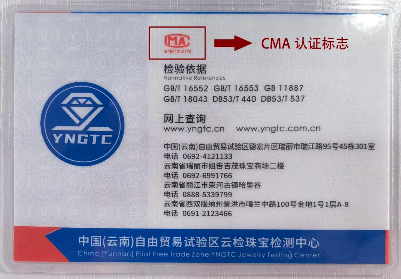 B体育是根据《中华人民共和国计量法》、《中华人民共和国标准化法》、《中华人民共和国产品质量法》、《检验检测机构管理办法》等有关规定,通过了云南省市场监管局的检验检测机构资质认定评审,取得资质证书,主要开展珠宝玉石及贵金属检验检测工作的第三方公正机构,中心所出具数据(证书和报告)具备法律效力并承担相应的责任。B体育出具的证书上有明显的CMA认证标志。